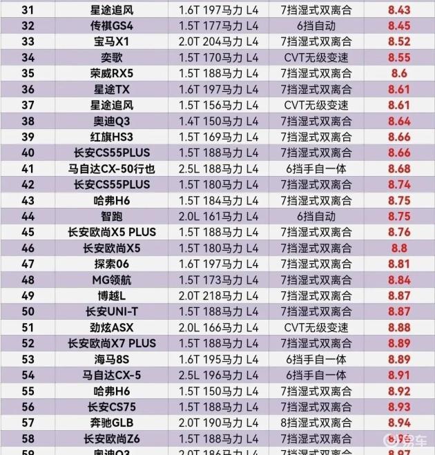 榜单第31至60名属于主流竞争区间,油耗多在8.4至9.0升之间,涵盖大部分热销车型。这一区间可以视为市场的平均水平。豪华品牌如宝马X1,油耗为8.52升,表现尚可。国产车如哈弗H6和长安CS55 PLUS,油耗分别为8.75升和8.66升,具备较强的竞争力。动力和油耗之间的平衡始终是一个难题,如奔驰GLB 2.0T,油耗为8.94升,马自达CX-5 2.5L,油耗为8.91升,动力输出虽强,但油耗也随之增加。这可能是由于需要兼顾动力、空间和配置等因素,难以达到完美平衡,需综合考虑。