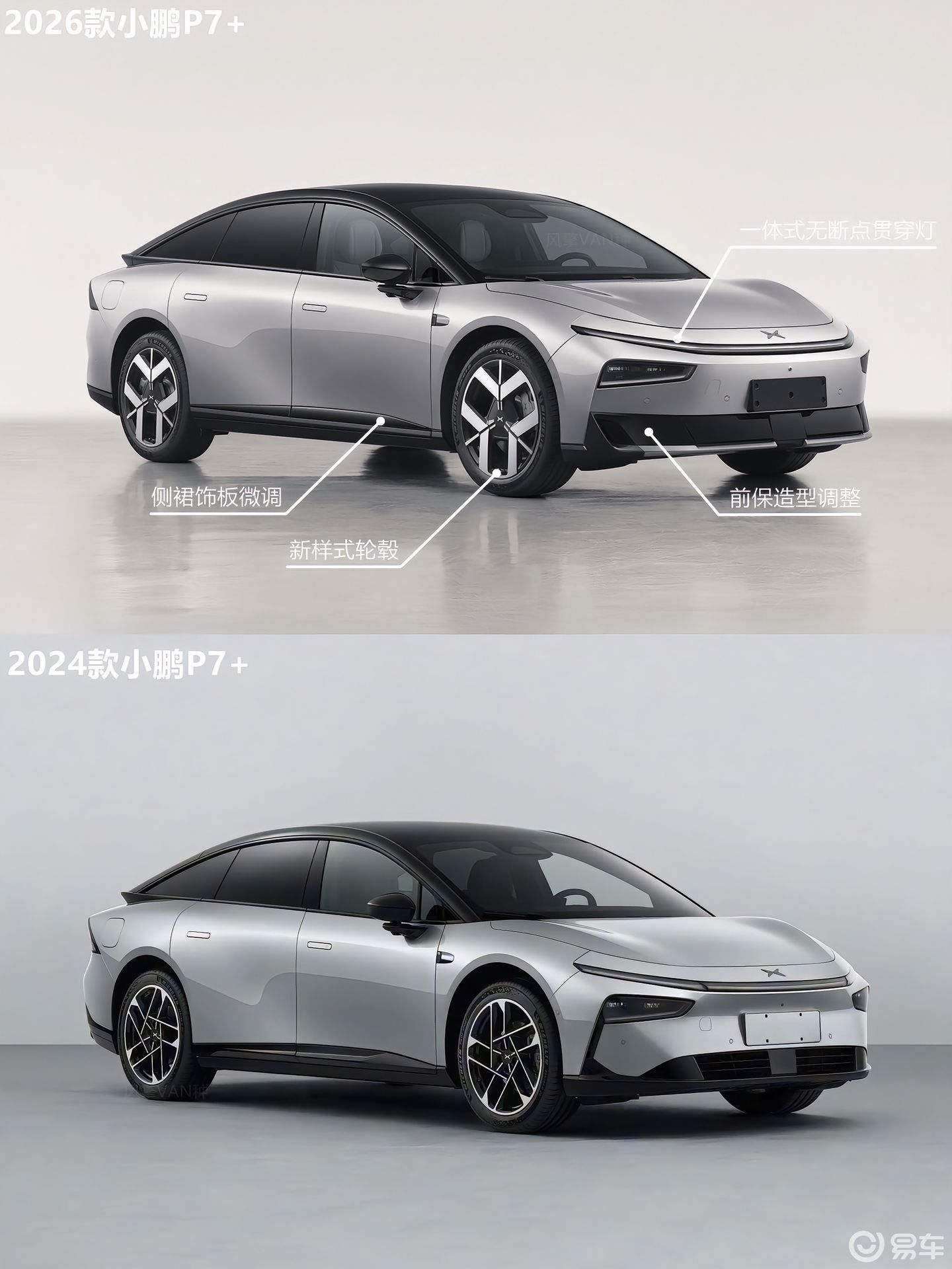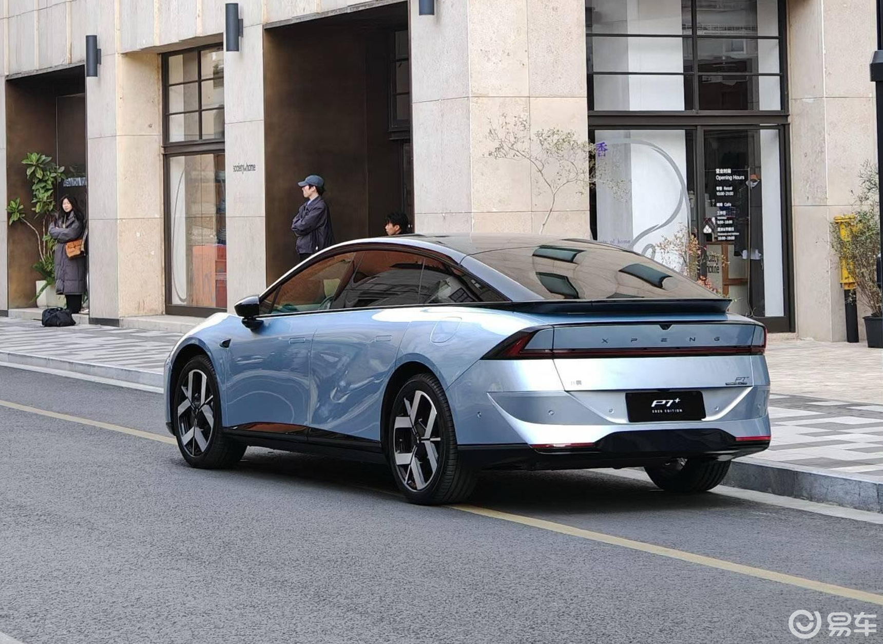 车身尺寸长宽高分别为5071/1937/1512mm,轴距3000mm,相比现款车型加长15mm,其余数据则保持一致。车身侧面也继续采用溜背式造型,再配合悬浮式车顶和双层尾翼,营造运动气息。不同的是,26款小鹏P7+将换装全新的三叶草轮毂和双色风车轮毂,规格为19/20英寸。贯穿式尾灯进行上下翻转,并增加“小蓝灯”,而重新设计的后包围加入车身同色设计与凌厉的线条勾勒。