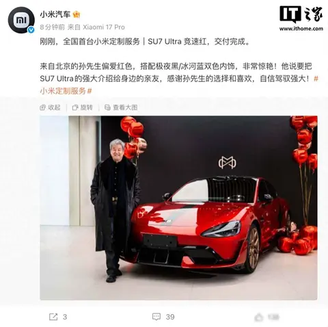 2026年1月9日,北京的孙先生提走了全国第一辆小米SU7 Ultra(图片|配置|询价)定制车,这辆车不是从现成颜色里选的,而是完全按照他自己的喜好定制的,外观选了“竞速红”,内饰用了“极夜黑搭配冰河蓝”,这是小米去年9月推出的高端定制服务的第一台实车,属于用来测试市场的样本车型。