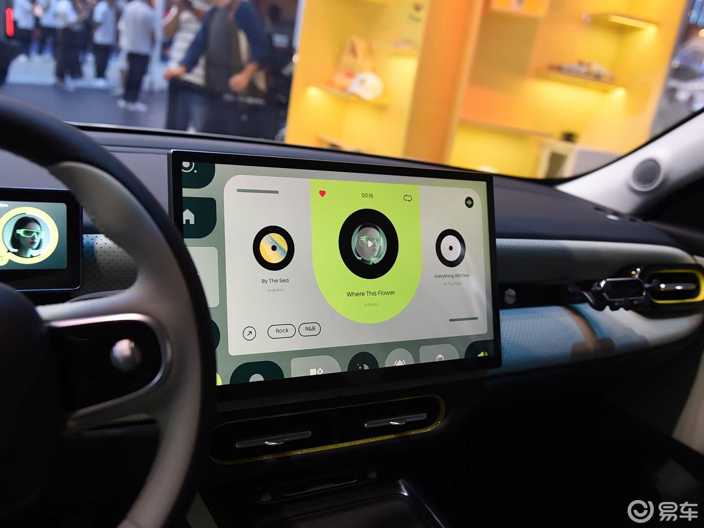 内饰采用了米白色、黑色的双色设计,并且还有不少荧绿色的镀铬点缀,不仅视觉效果很不错,看起来也是充满年轻活力。整个中控台也设计的很简洁,搭载了一块15.6英寸的超大中控屏,除了少部分的几个实体功能按键,大部分的功能也都集中到屏幕里,再加上悬浮式的液晶仪表盘,整体的科技感还是非常足。双幅式方向盘的造型也比较精致,采用怀挡式设计,而这也使得前排中央扶手台的可用区域比较大,拥有多个储物空间。