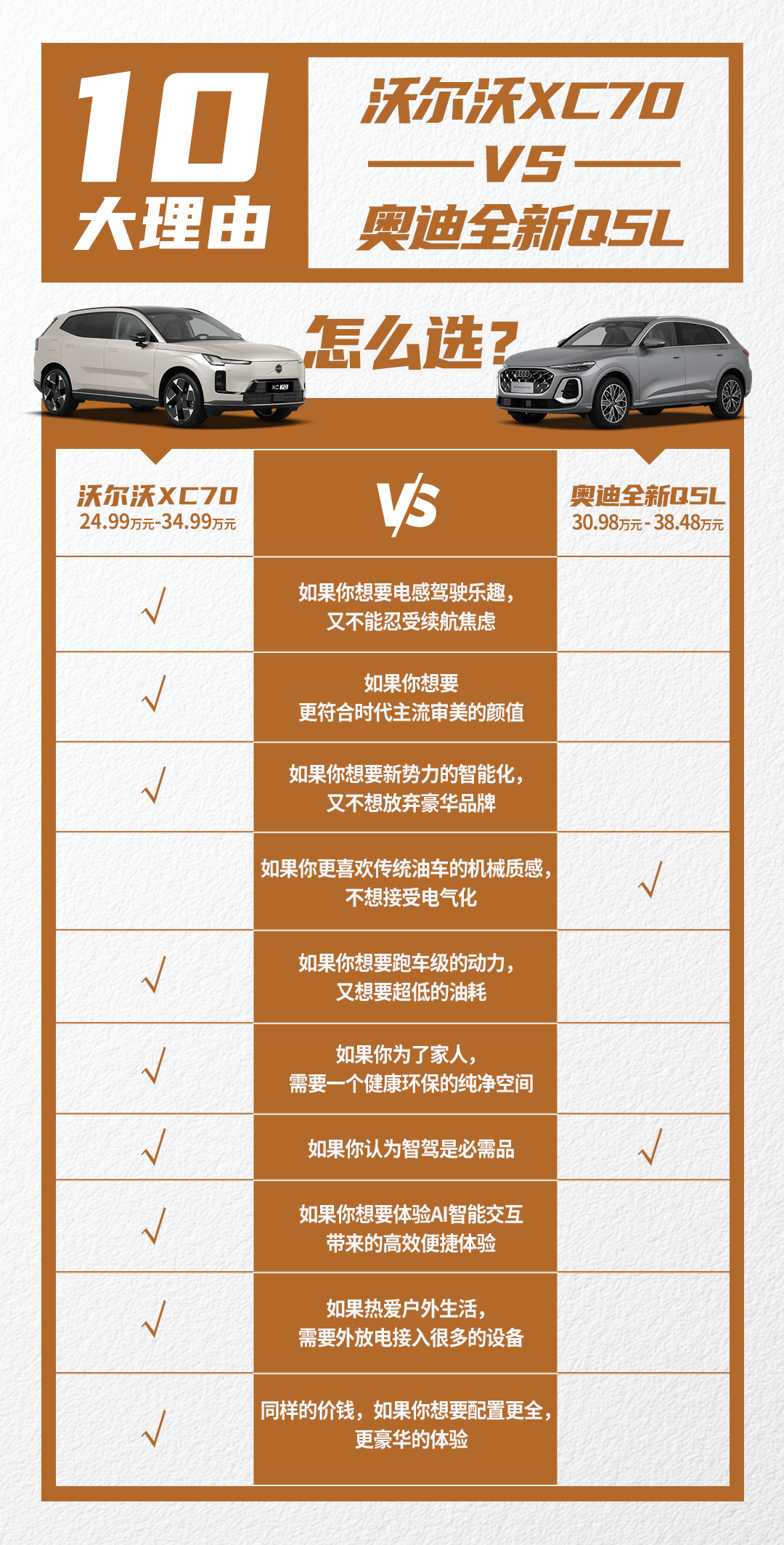 对于豪华SUV用户来说,几乎没有人不会在意一辆车的驾驶体验。当然了,大家在目前也有了很多新需求,比如“既要开得爽,也要开得省”。对此,采用超混动力的全新XC70和采用燃油轻混动力的全新Q5L,谁能满足复杂需求?
