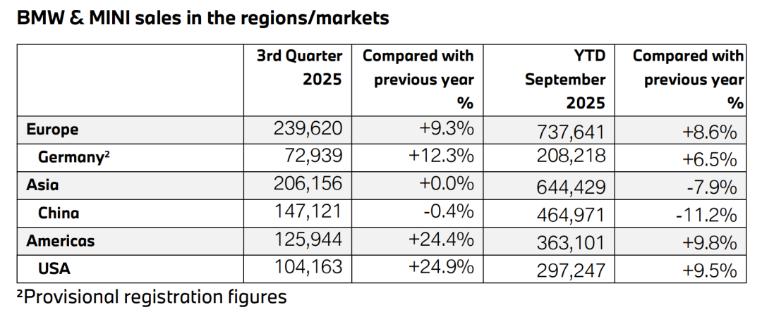 在亚洲市场,宝马集团三季度销量206,156辆,与同期销量持平,前三季度累计销量644,429辆,同比下滑7.9%。其中,作为宝马全球最大单一市场,宝马集团在中国市场前三季度累计销量464,971辆,同比下滑11.2%,其中三季度销量147,121辆,同比下滑0.4%,占全球总销量25%,为全球最大单一市场。