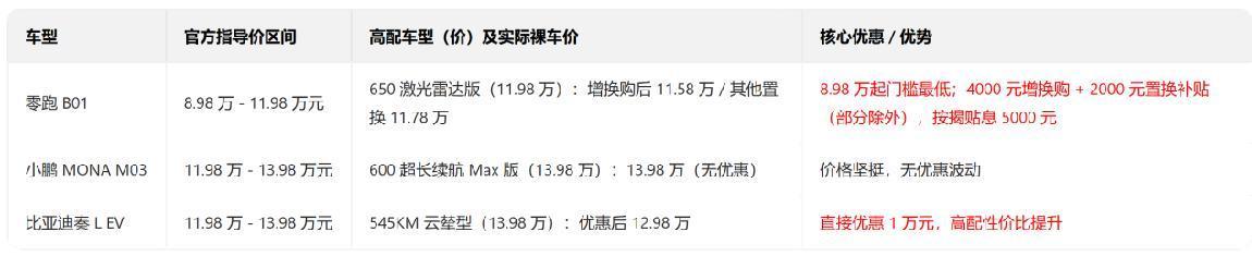 首先对比官方指导价:零跑 B01 为 8.98 万 - 11.98 万元,小鹏 MONA M03 与比亚迪秦 L EV 均为 11.98 万 - 13.98 万元。零跑 B01 入手门槛最低(8.98 万裸车价起),高配车型也仅 11.98 万元,另两款车型的入门及高配门槛均更高。