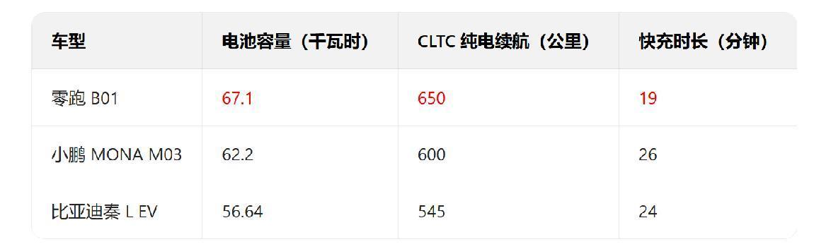 三款车均采用磷酸铁锂电池。其中零跑 B01 采用 67.1 千瓦时电池,CLTC 纯电续航可达 650 公里;小鹏 MONA M03 为 62.2 千瓦时电池,CLTC 纯电续航 600 公里;比亚迪秦 L EV 为 56.64 千瓦时电池,CLTC 纯电续航 545 公里。在充电的部分,这三款车都是支持快充的,基本能在 30 分钟以内充满,不过只是时间上有所不同。其中零跑 B01 充满只需要 19 分钟,相比之下,小鹏 MONA M03 需要 26 分钟、比亚迪秦 L EV 需要 24 分钟,零跑 B01 在充电的效率上还是要强上不少。