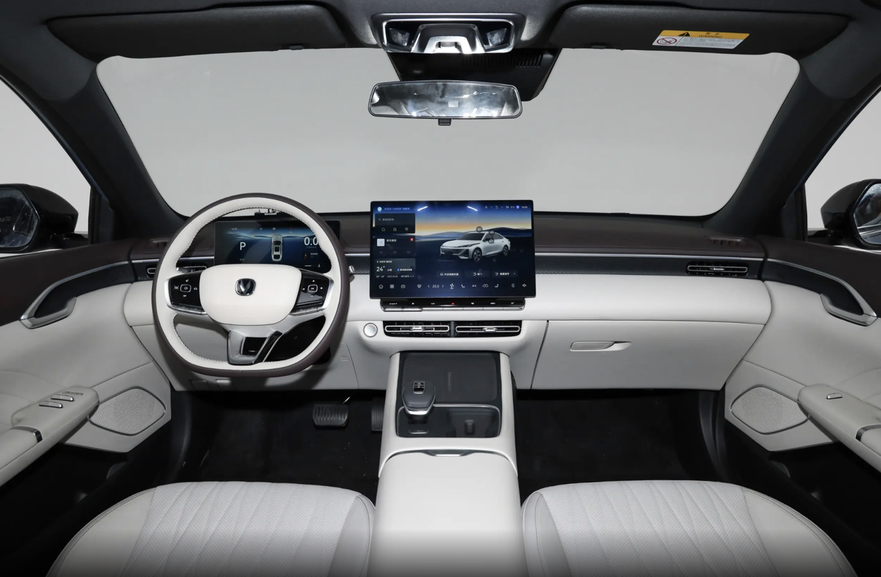 坐进车内,两款车的差异更为明显。第四代逸动采用环抱式驾驶舱设计,其星轨层叠架构通过12°驾驶员导向倾角,搭配10.25英寸的全液晶仪表盘和14.6英寸的多媒体中控屏幕,科技感拉满,下方还配有物理按键、空调出风口、无线充电面板、电子换挡机构和双杯架,实用性很强。