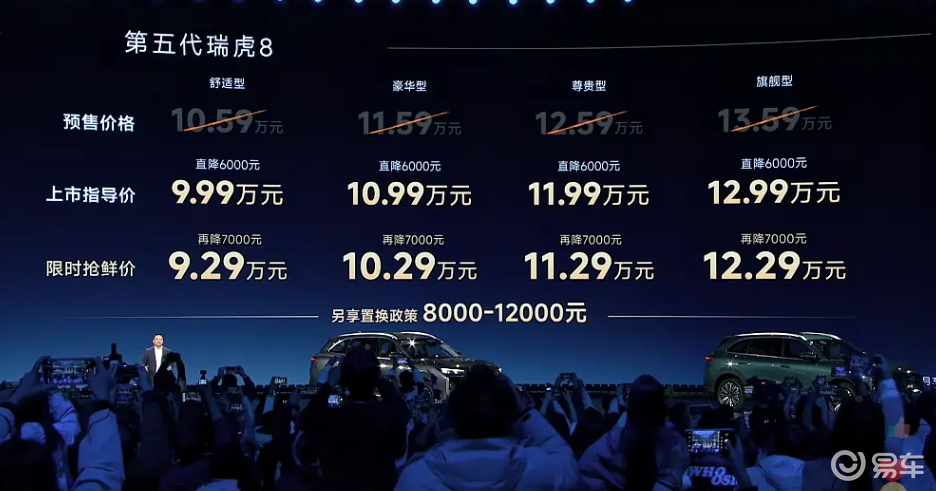 11月10日,奇瑞第五代瑞虎8正式上市,售价为9.99万-12.99万元,限时抢鲜价9.29万-12.29万,不仅放弃了“七座”打法,专攻家用大五座SUV,还以“双外观+双内饰”,以及大空间和智能化配置等卖点,从而增强了新车在主流SUV市场竞争力。