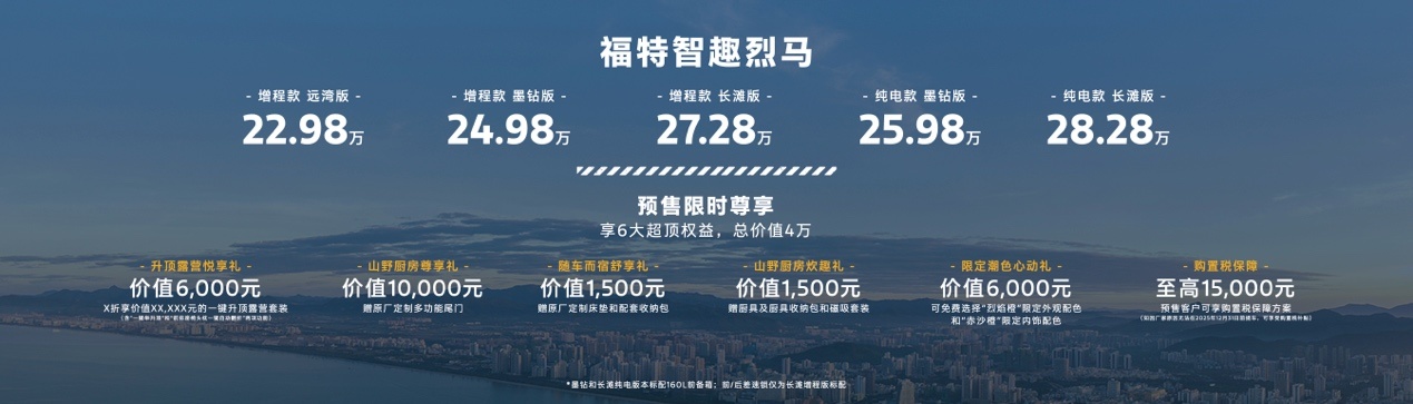 福特智趣烈马纯电版配备105.4度电池,CLTC续航650km,总功率332kW;增程版配备43.7度电池,纯电续航220km,满油满电综合续航1220km,系统综合功率310kW,馈电油耗7.25L/100km。底盘方面,前桥采用铝合金双叉臂独立悬挂,三合一电驱总成让车辆零百加速达5秒级,增程版综合功率310kW、峰值扭矩600N・m,纯电版总功率332kW、峰值扭矩575N・m。