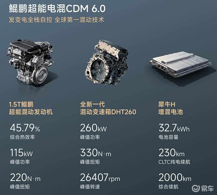 全新一代混动变速箱DHT260,最大功率260kW、峰值扭矩330N·m,最高98.5%机械效率,系统电驱效率90%,实测26407rpm峰值转速。