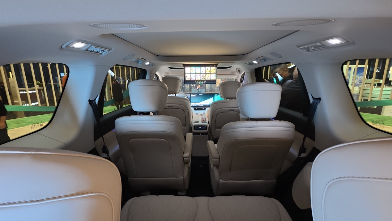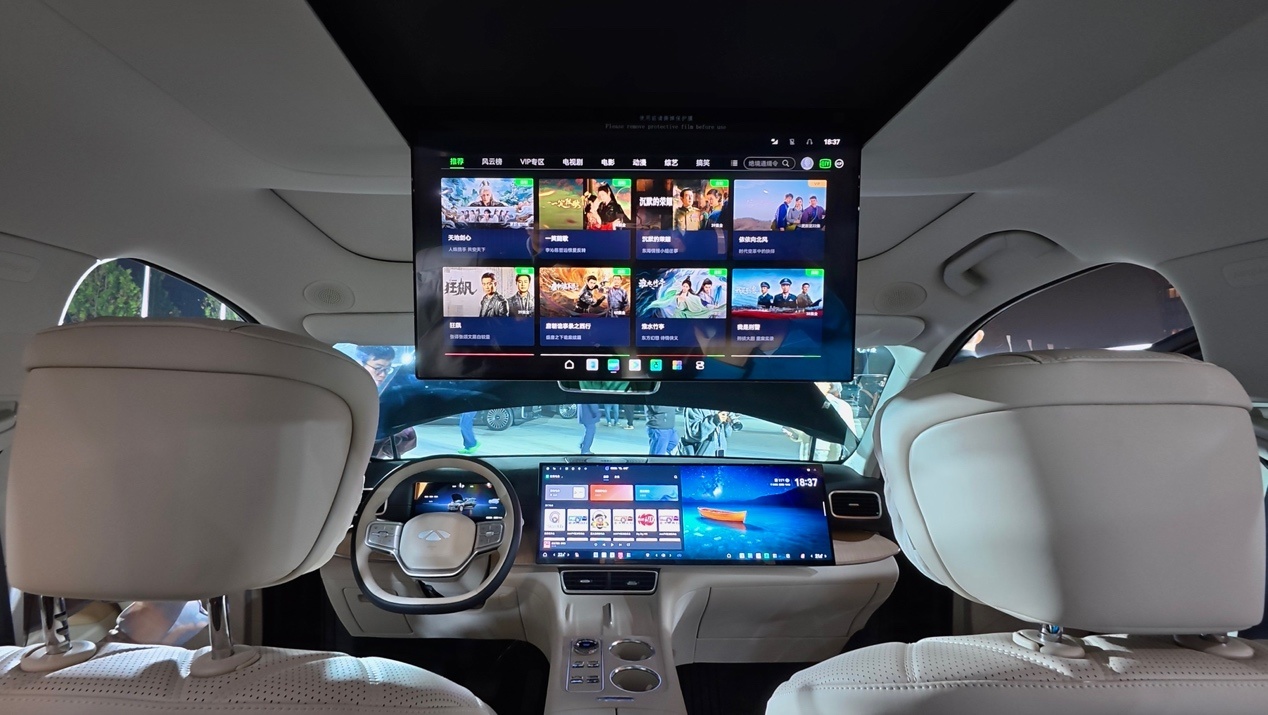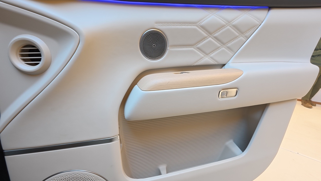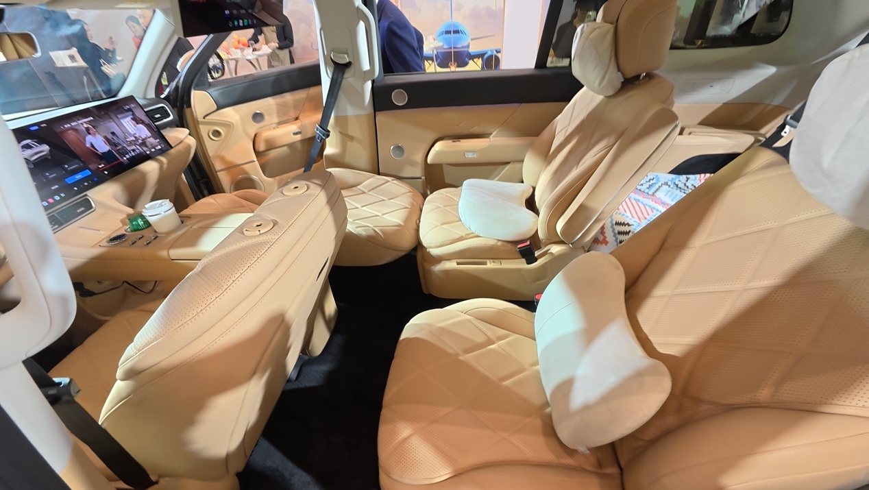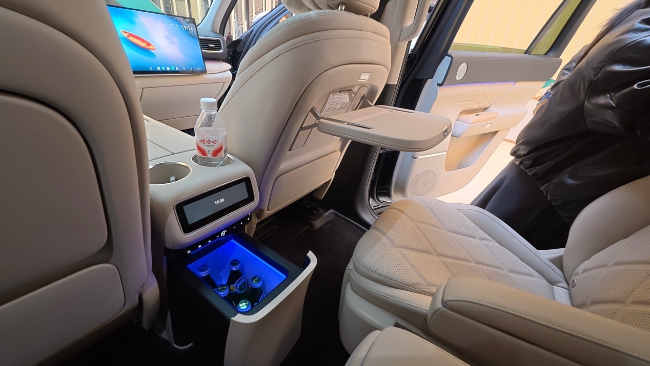 车内采用2+2+2六座布局,第一、二排座椅标配通风与加热功能。中高配车型增加第一排/第二排座椅按摩、二排右侧零重力座椅、第三排座椅加热/电动调节等配置。顶配版(220四驱 全家乐)还配备第二排小桌板。全系标配10.25英寸液晶仪表与30英寸一体式双联屏,搭载高通8255车机芯片,支持多种手机互联功能。全系标配伯牙之音23扬声器音响系统、第二排/第三排隐私玻璃、分段式全景天窗等配置。