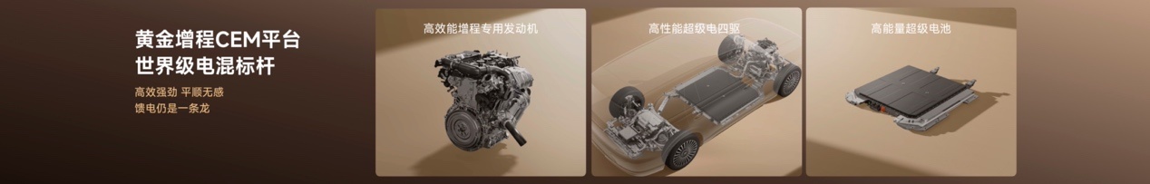 搭载1.5T增程动力系统,可选后驱配容量33.68kWh和四驱配39.92kWh容量电池组。后驱版电机最大功率195千瓦,峰值扭矩324牛·米,官方零百加速时间为9.3秒。最低荷电状态油耗6.1L/100km.