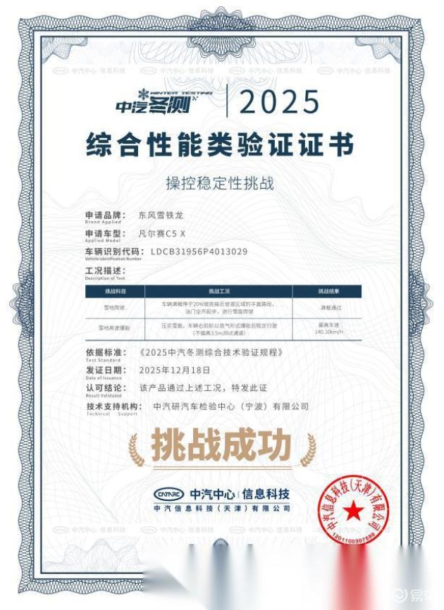 12月18日,在中国汽车技术研究中心主办的“2025极寒驾控安全主题技术验证”中,东风雪铁龙凡尔赛C5 X与东风标致508L凭借卓越的操控稳定性,双双获得“操控稳定性挑战”验证证书。其中,凡尔赛C5 X在雪地爬坡与雪地高速爆胎测试中表现稳健,东风标致508L则在雪地双移线与雪地蛇形测试中展现出精准的操控性能。这一成绩充分验证了两款车型扎实的整车品质与法系品牌在极端环境下的安全技术实力。