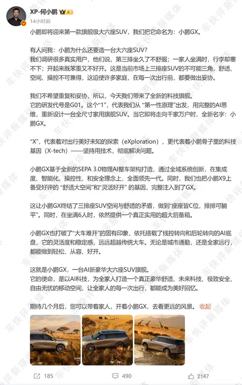不过看起来,小鹏汽车董事长何小鹏好像是等不及了。因为就在2月5日,他在个人社交账号发布了旗舰大6座SUV的相关信息,新车将会命名为小鹏GX(图片)。