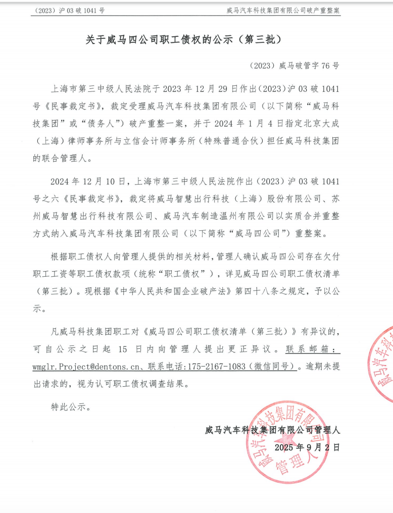 威马汽车的财务困境对各方造成了严重影响。重整案附表显示,除去国家税务总局上海市青浦区税务局的266.32万元,威马汽车拖欠的员工薪资、赔偿金和福利金超过4000万元,人均债权金额超过10万元。